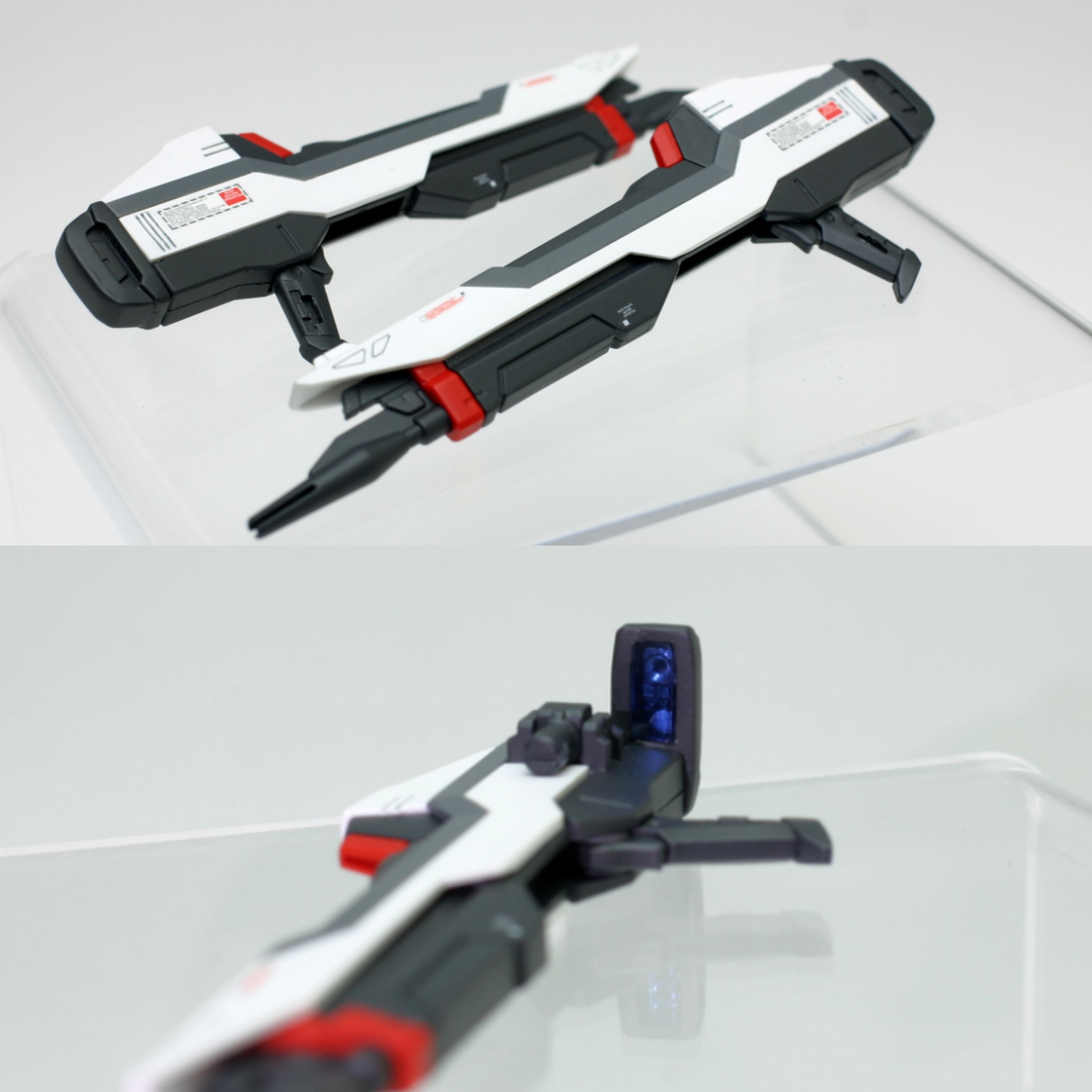 頭部前後のセンサーはいずれも中にメタルパイプを配置したうえで、塗装した透明プラ板を使い2重構造化。肩アーマー上面はプラ棒によるレッドポイントにてアクセントを追加。