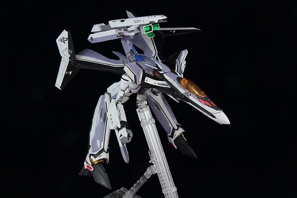 バトロイド形態では機首部分を変形させ、機種後方部分を上部へ移動、更に後方部分を下部へと移行させるなど、非常に複雑な変形機構ながらも、その機構を見事再現しつつ、きちんと固定できるように設計されているなど、技術的な凄さを感じることが出来ます。塗装をしていると、気を使う部分ではありますので、自分も撮影時以外は基本的にファイターモードでの展示に絞っています。